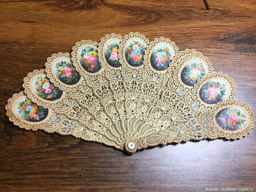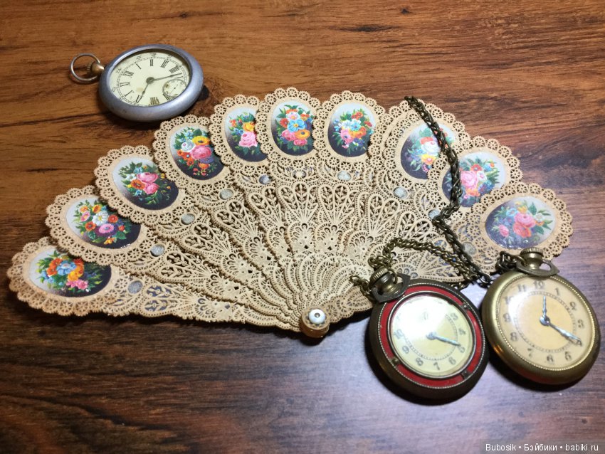 В конце совершено классный веер, вырублен из плотной бумаги. Пока в руках не подержишь, не поймешь, из чего сделано. Ну и кукольные часики:)
