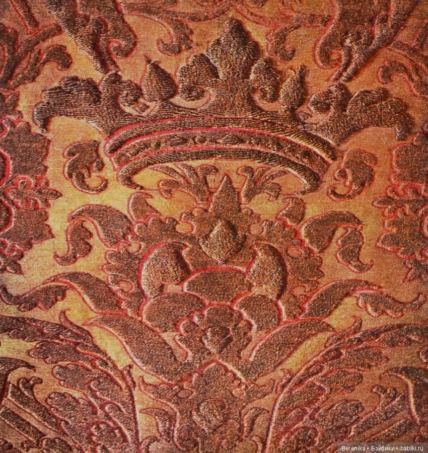 Образцы, представленные в фондах ГИМа — это бархат, чаще темно-желтого, темно-красного и пурпурного цветов и узорчатое золотое шитье. Но основа и фон, все-таки бархат.