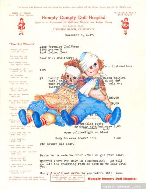 Это присказка… Далее, автор рассказывает о художнике(мастере), с гордостью ставившем свое клеймо на созданных ею куклах.Это Эмма Клир.