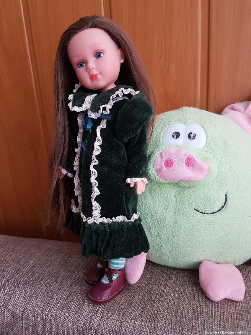 Результат для меня удовлетворительный ( первый блин — как говорится). Стоит очень тщательно выбирать ширину и рисунок купона при шитье подобных вещей применительно к каждой кукле.