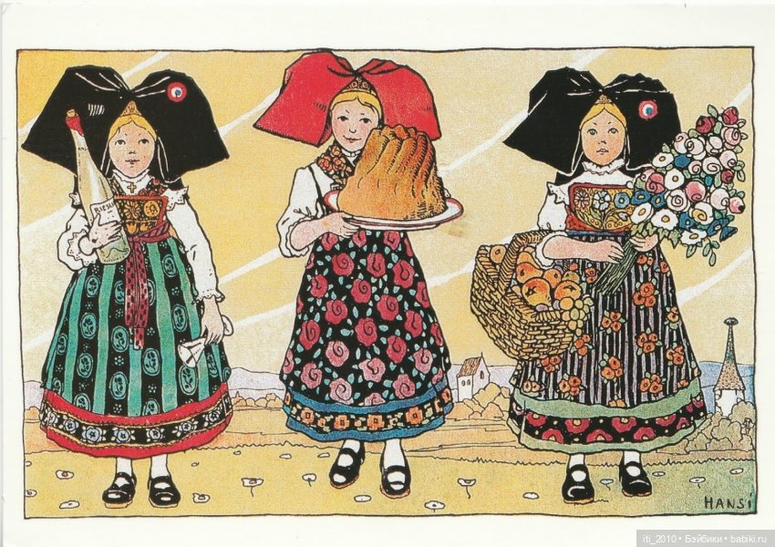 Эти банты, которые кажутся нам сегодня характерными для всего Эльзаса, были распространены только на четверти территории Эльзаса, в основном в местностях недалеко от Страсбурга. Но с легкой руки иллюстраторов- фольклористов (таких как Анси) этот фасон стал восприниматься как основной и чуть ли не единственный, и со временем стал символом целого региона.