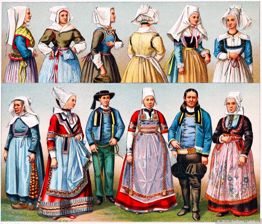 На полуострове Бретань любили пестрые красные юбки, их подбирали с боков, открывая вторую юбку. А в округе Финистер черные юбки носили с широкими и длинными фартуками из белой парчи или полосатого сатина. Для Бретани были характерны и фартуки с нагрудниками.