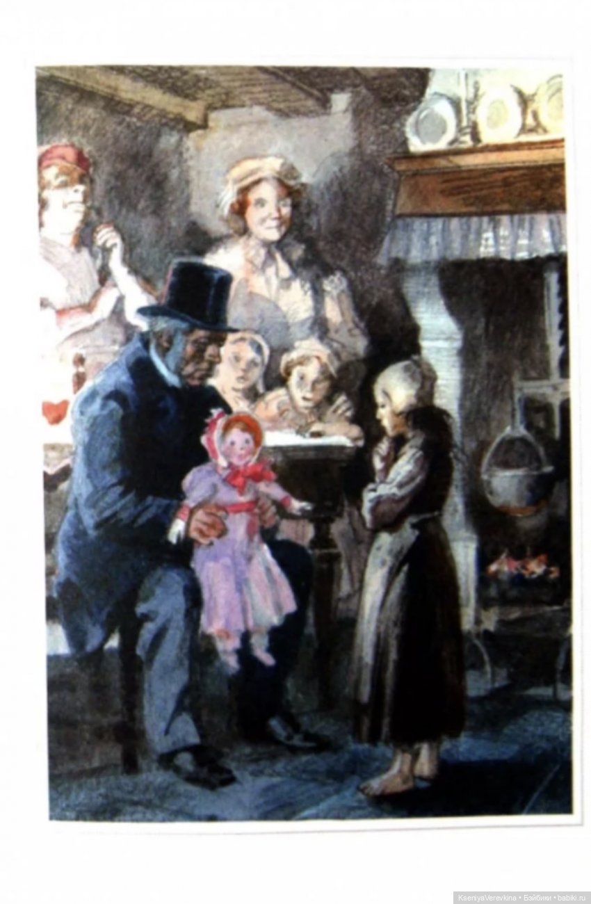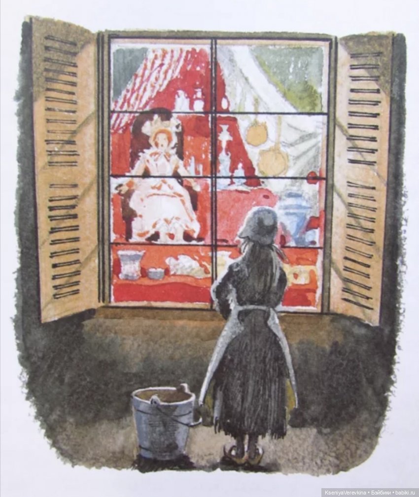 « Даже в ту минуту, когда Козетта вышла с ведром в руке, мрачная и подавленная, она не могла удержаться, чтобы не посмотреть на дивную куклу, на эту «даму», как она называла её. Бедное дитя замерло на месте. Козетта ещё не видала этой куклы вблизи. Вся лавочка казалась ей дворцом, а кукла – сказочным видением. Это был восторг, великолепие, богатство, счастье, возникшее в каком-то призрачном сиянии перед маленьким жалким существом, поверженным в бездонную, чёрную, леденящую нужду. Козетта с присущей детям простодушной и прискорбной проницательностью измеряла пропасть, отделявшую её от этой куклы. Она говорила себе, что надо быть королевой или по меньшей мере принцессой, чтобы играть с такой «вещью». Она любовалась чудесным розовым платьем, роскошными блестящими волосами и думала: «Какая счастливица эта кукла!» И девочка не могла отвести глаз от волшебной лавки.»