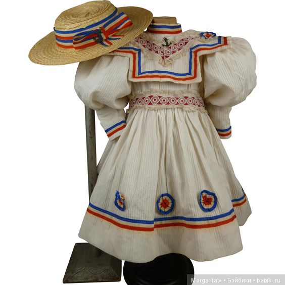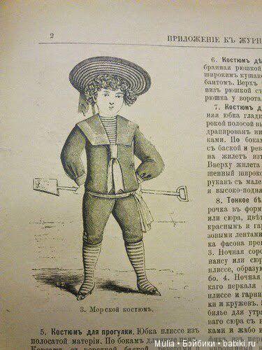 Как правило, костюм состоял из матроски – блузы с квадратным воротником – и брюк либо юбки (для девочек). Под воротником нередко завязывали галстук или бант. Галстук мог быть и пришивным. К костюму надевали широкополую соломенную шляпу, бескозырку или берет с помпоном.