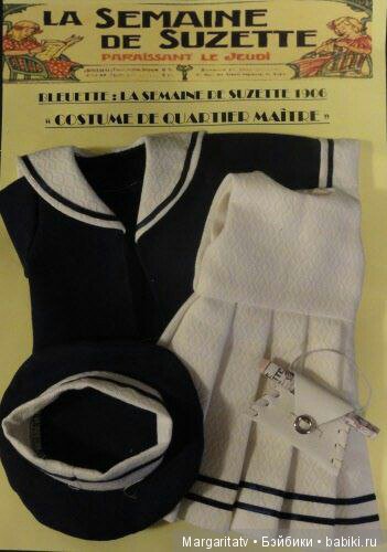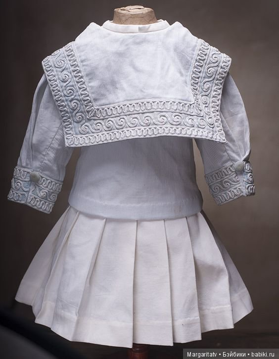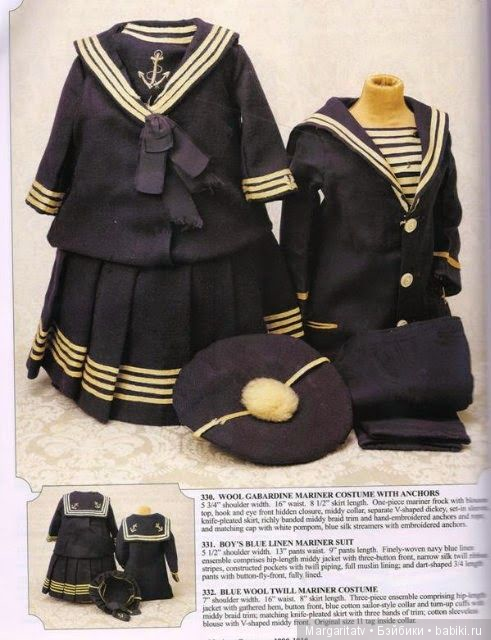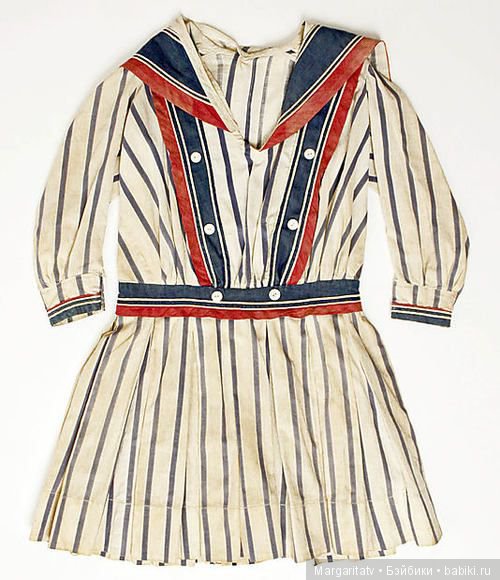 Первоначально матросский костюм был целиком белый, но во второй половине XIX в. под матроской стали понимать белую блузку и темные брюки или юбку. Позже этот костюм стал более разнообразным. Главное в нем – «матросская тема»: сочетание синего и белого цветов, отделка полосками и якорями.
