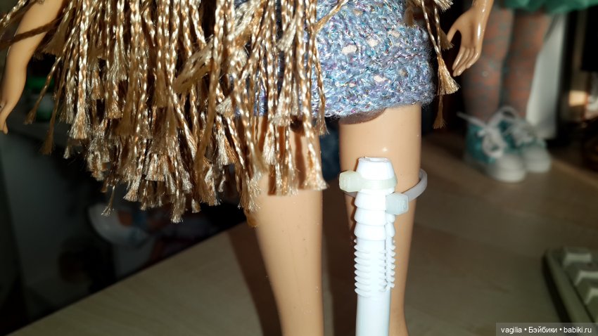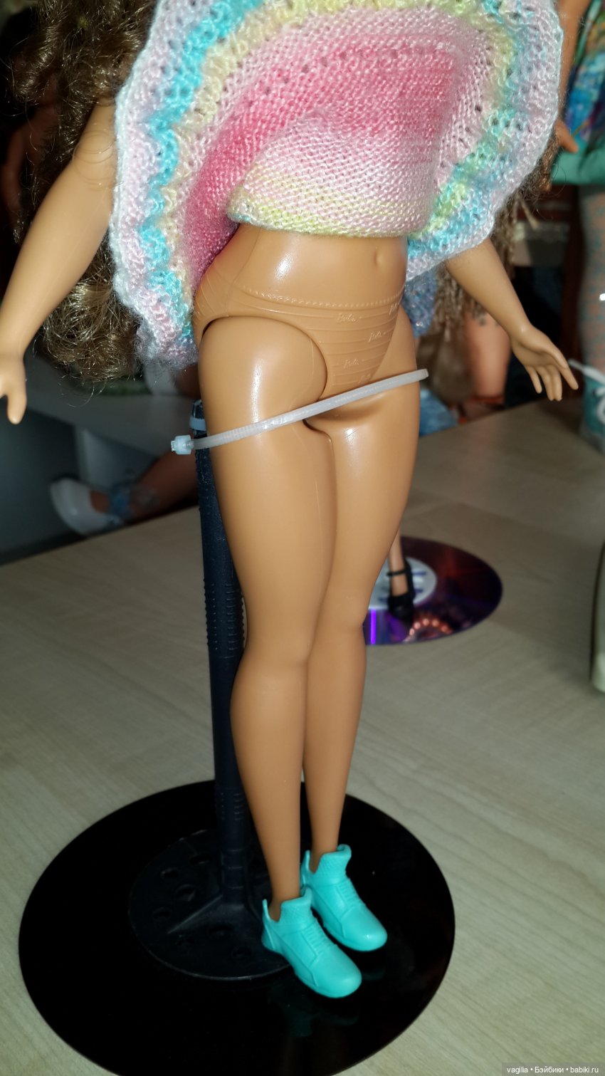 Обычная худая барби стоит идеально, а вот у пышки попа толстовата, оттопыривается, но не падает, думаю надо использовать не стяжку, а что-нибудь твердое.