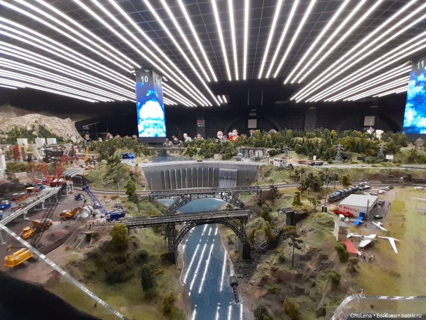 Целый пейзаж с домиками, мельницами, водонапорными башнями и железной дорогой. Оплачиваешь, и начинают паровозики ездить. Красота!