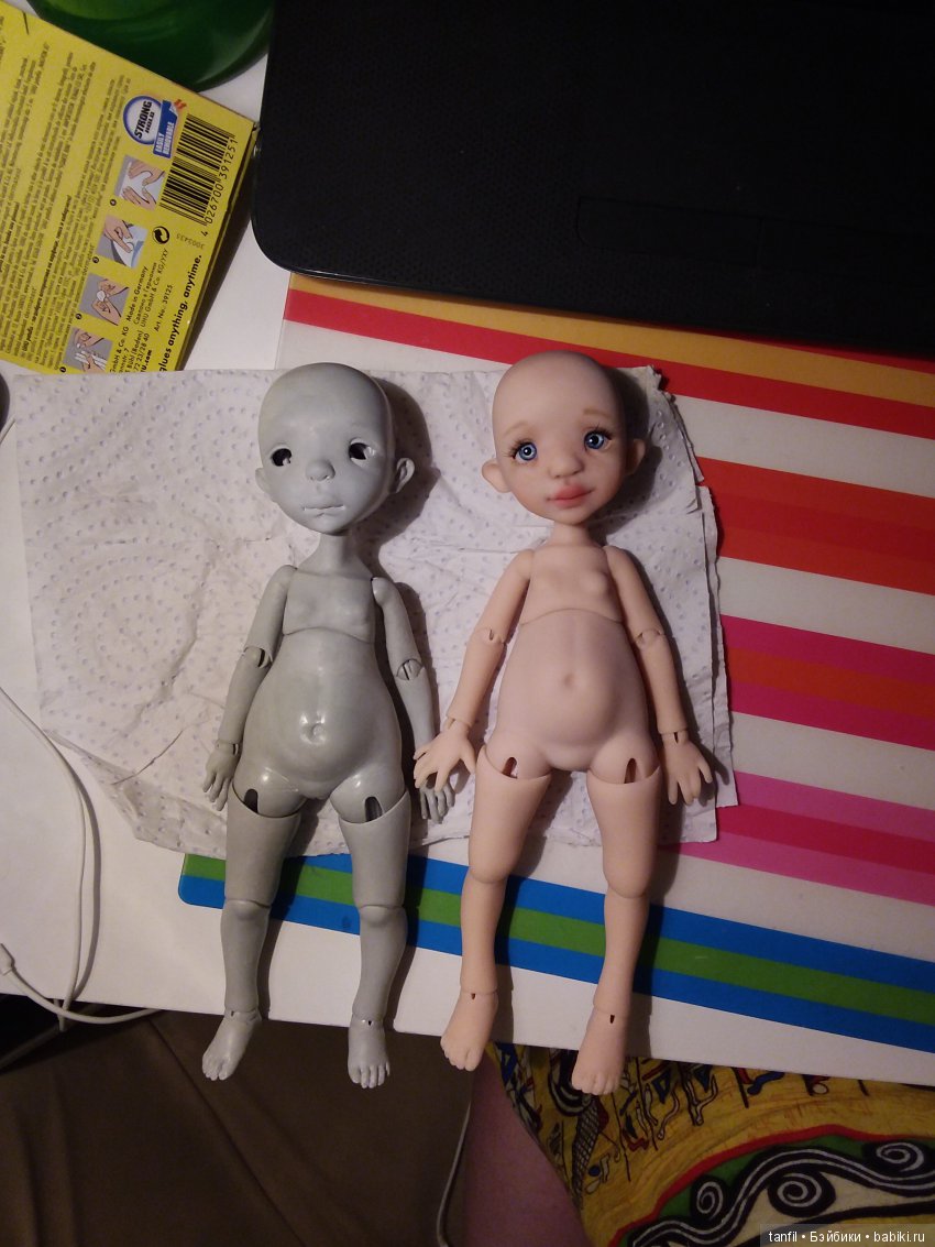 — Впервые увидела шарнирную куклу в интернете, когда сидела в декрете с сыном в 2012 году. Это были куклы Марины Бычковой. Очень захотелось попробовать сделать. Но в то время в моем городе не продавалось полимерной глины… вообще ничего кроме пластилина. И тогда я начала делать куклу из клея пва+крем+крахмал. В интернете он называется «холодный фарфор». Потом были еще попытки из ладола… и вот наконец то появился в продаже фимо. Первая кукла была сделана страшненькая, лупоглазая. Через какое то время к ней присоединилась на полочке еще одна… и еще одна… куклы потекли рекой, появился интерес. Анатомию смотрела на домашних, какие-то конкретные детали интернете… и так потихоньку училась. От куклы до куклы опыт рос.