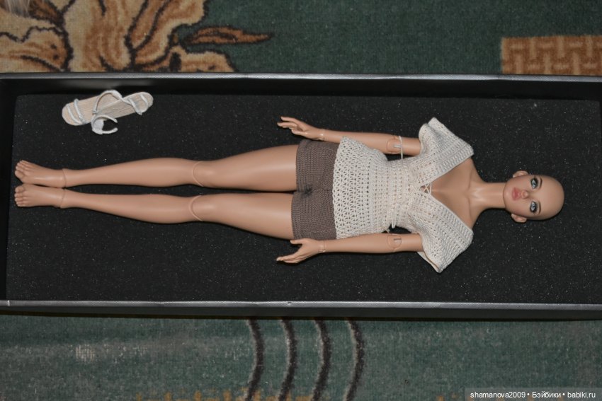Сама куколка хранится всё время в родной коробке — на темном поролоновом родном матрасике, бывает одетой, бывает нет. Сейчас она в одежде из гипоаллергенной пряжи, но пятна уже были.