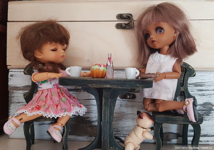 Девчонки гостеприимно приглашают выпить чаю, правда одеты они по — дачному, по-летнему..) А Ваш Дуду прям маленький дэнди!