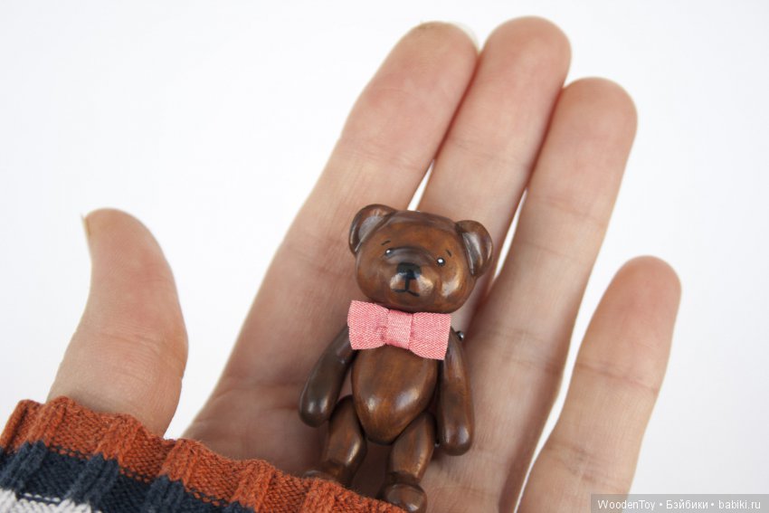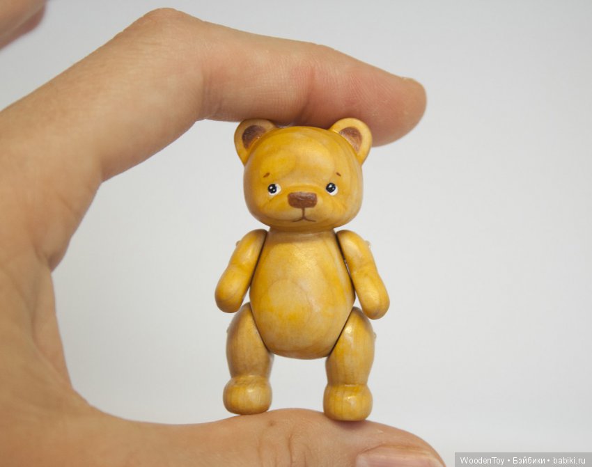 Все начиналось с миниатюры, мои первые деревянные игрушки были совсем крошками, всего 3 см, а первый подвижный мишка был всего 4.5 см. Со временем они стали расти и совершенствоваться, этот карапуз, самый большой из тех, что я делала ( 11 см), и такой размер мне очень понравился! Думаю буду чаще делать именно таких ребят!