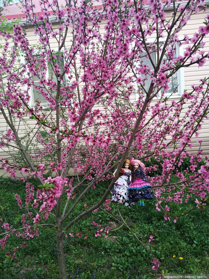 В японии цветет сакура, ну а у нас персик, да так красиво, дикий персик, молодые деревья… два года назад мы старые спилили, они не плодоносили уже, персики мелкие, но вкусные очень… от пенечка пошли ростки и я оставила самые сильные и вуаля-два молодых деревца… а тут и три феи прилетели, такие маленькие и нежные и хрупкие)