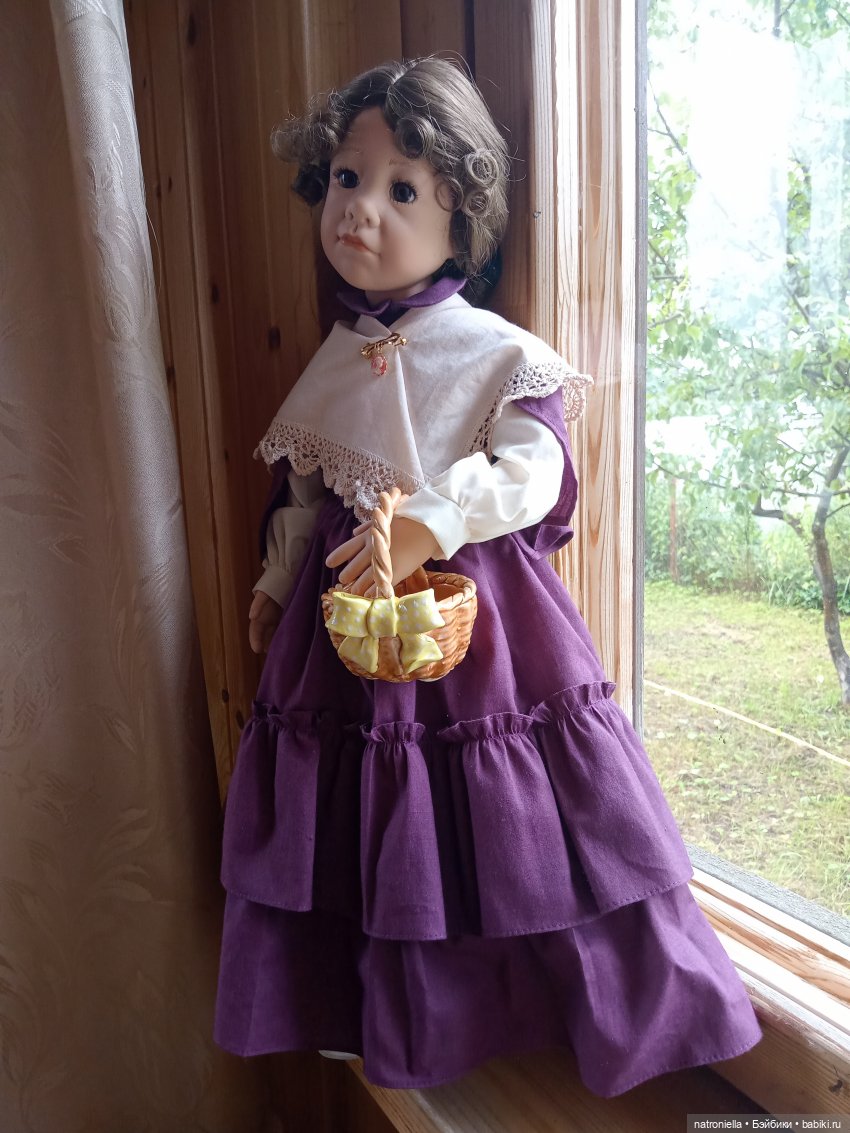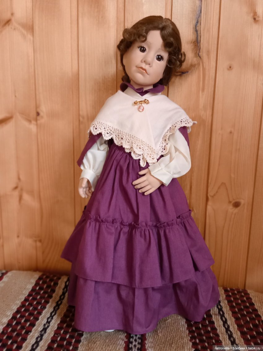 Поверх наряда надета молочного цвета шаль, отороченная кружевом и скрепленная булавкой с камеей. Всё как настоящее! Наряд настолько продуманный и стилистически точный, что переодевать куклу не хочется даже на время.