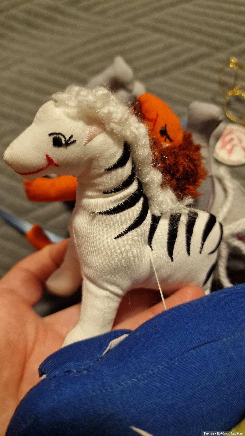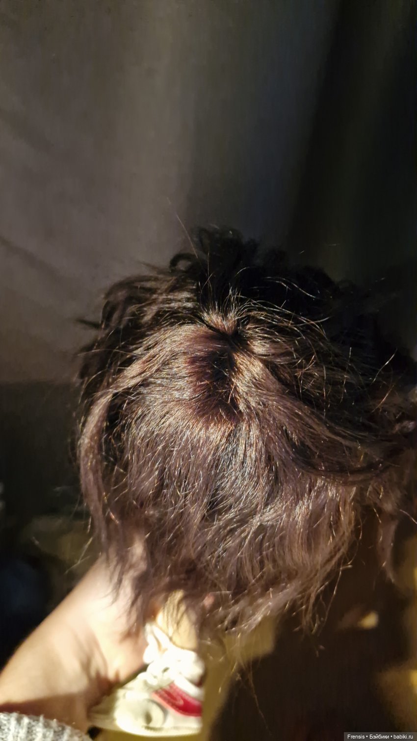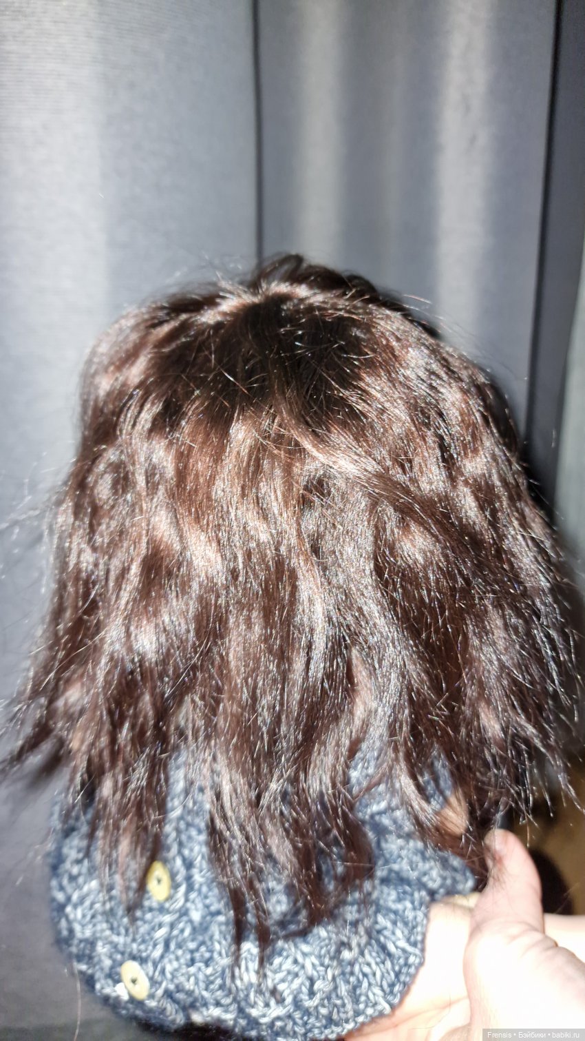 Короче, психанула я: нашла козьи трессы и старый носок-след. И вот. Не то чтобы идеально, но теперь девочка и лохматая посидеть может, и с другой прической. Родной парик в целости и сохранности, разумеется.