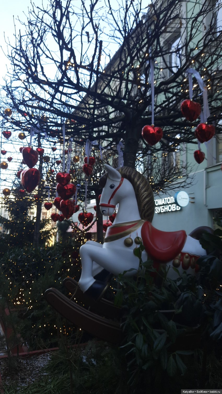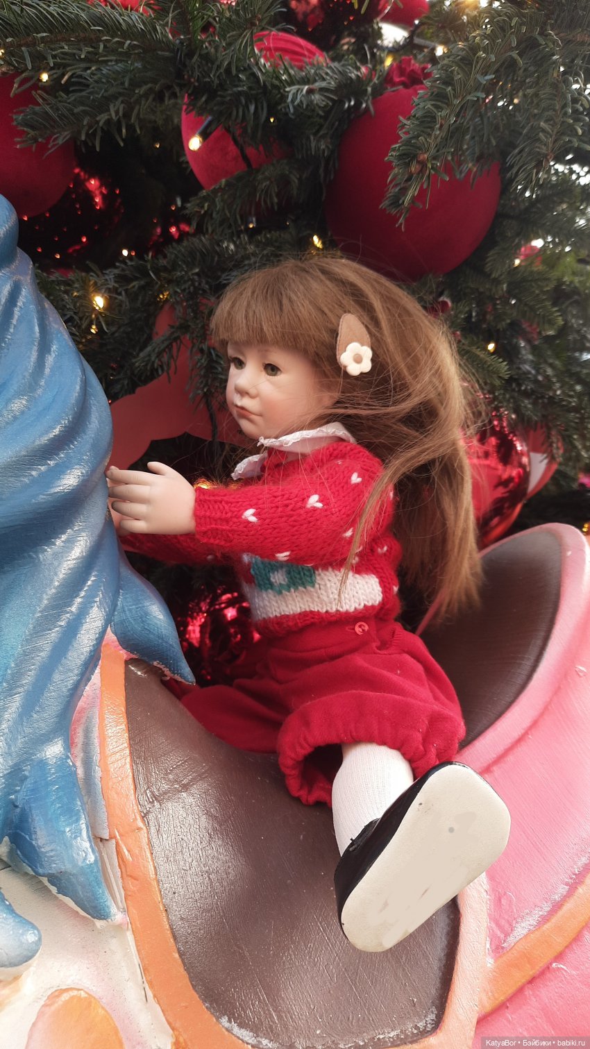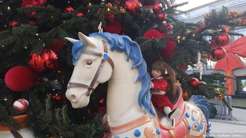 У елочки с конями ко мне подскочил охранник и стал строго выговаривать, что трогать нельзя, т.к кони неустойчивы и падают. Ответила: «Ладно». И стала убирать куклу в рюкзак. Он снова подошел)) «А вы хотели сфотографировать куклу?» Киваю. Ну давайте, только аккуратно просто. Вот так, с разрешения охранника, даже с предложения, я бы сказала, Кристина прокатилась на праздничном коне!)