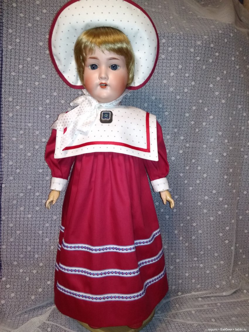 Куколка ко мне приехала красавицей, но с остатками антикварного паричка скорее всего не родного и в ветхом антикварном платье, возможно родном. Поэтому по — приезду была нарядена в паричок какой был дома в наличии.