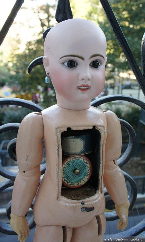 В 90-х годах 19-го века Эмиль Жюмо выпускал кукол с устройством типа фонографа, на которое записывались звуки — слова и фразы. Записывались они на специальных цилиндрах, эти цилиндры можно было менять. Для этого и служила крышка в передней части тела. Вот я и подумала, что переключатель на спинке у Вашей куколки мог включать такое устройство со звуком.