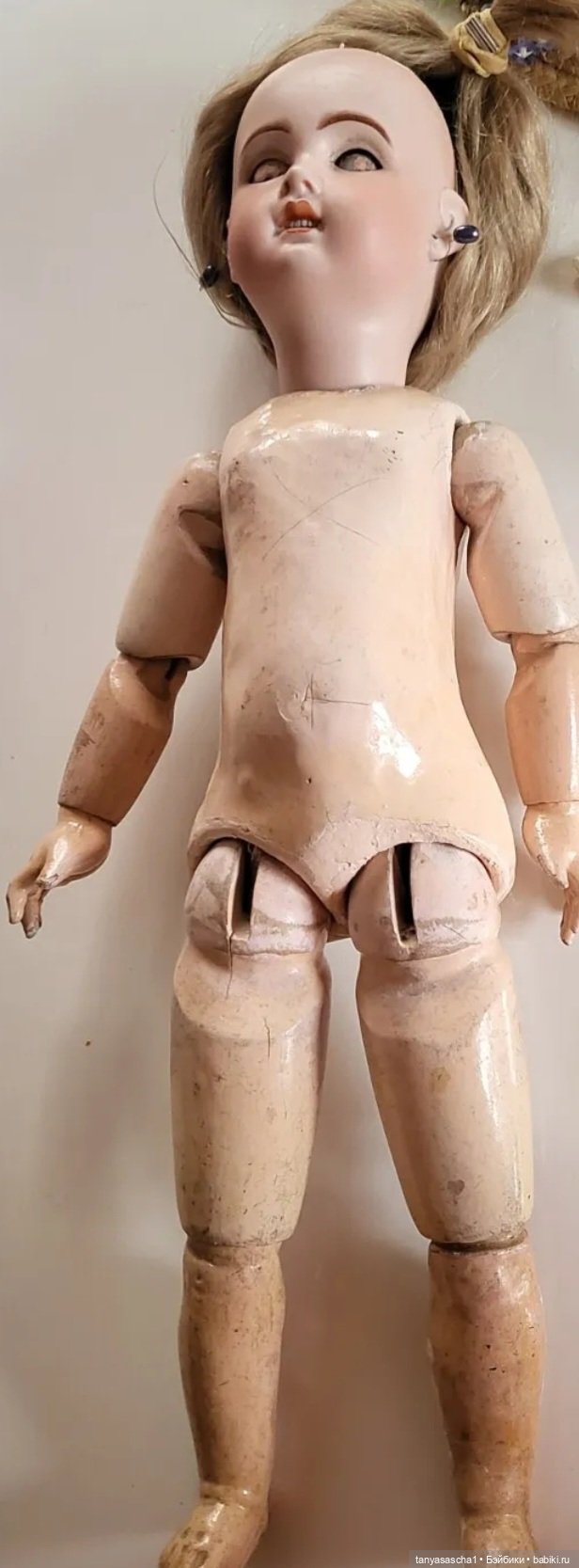 Пытаться что-то искусственно состарить, тяжёлая работа очень талантливого мастера. И сверху из спинки штырь видно какой то. Может тело не от жюмо! Но от французской куклы явно. Может кто-то что-то знает. Прям загадка.