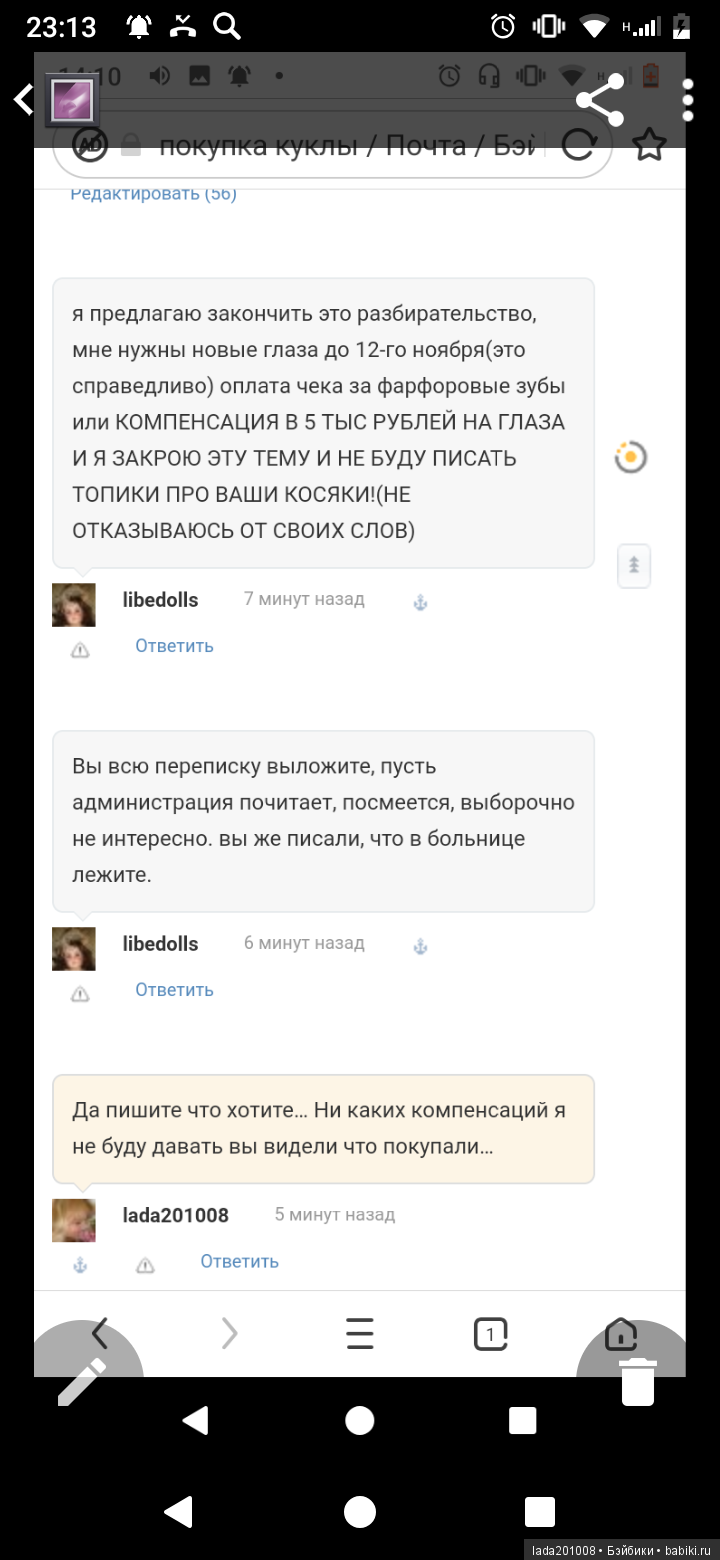 Я извините уж целый день просто хожу рыдаю за что не могу понять… Глаза стационарные кукла жила у меня 2 ода.Продавала по адекватной цене… Все принскрины переписки есть уж главное что с меня требуют компенсацию 5 т за глаза и зубы которые я якобы приклеила или устроит скандал… Помогите! Я готова ко всем комментариям.Скажите что я сделала не так? Меня обвинили в утаивание информации при том что кукла дошла в целости и сохранности и я не обманывала по поводу глаз они были фиксированные...