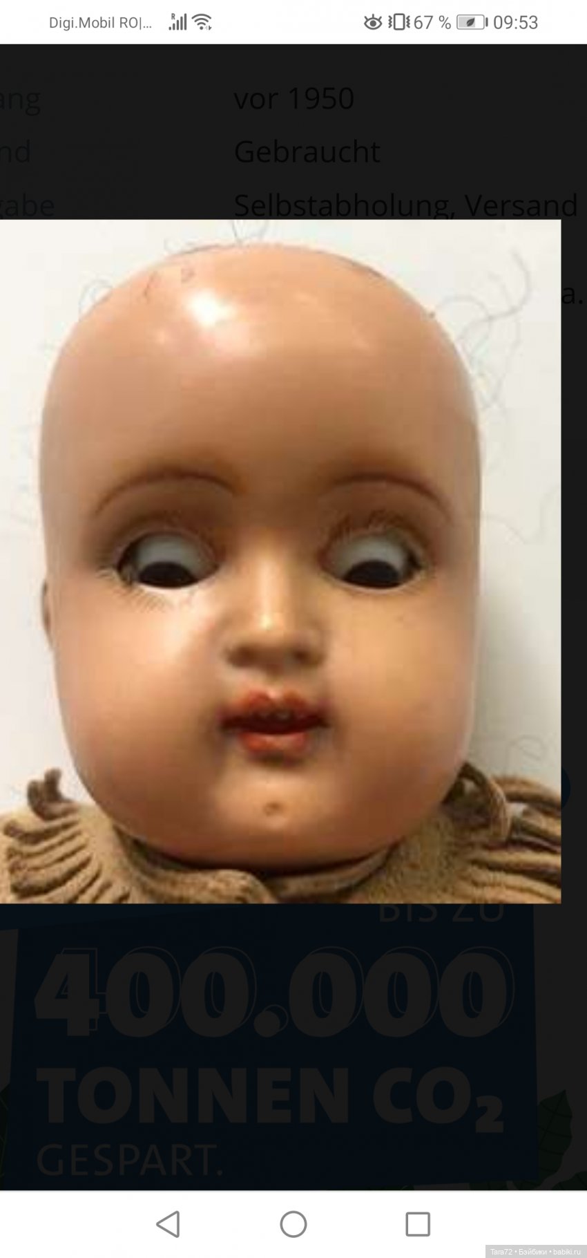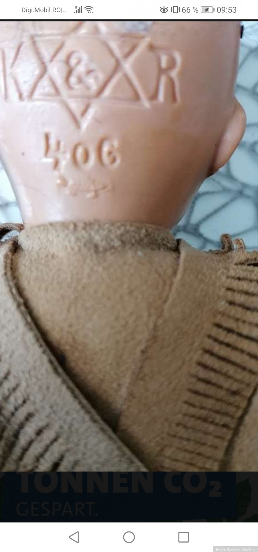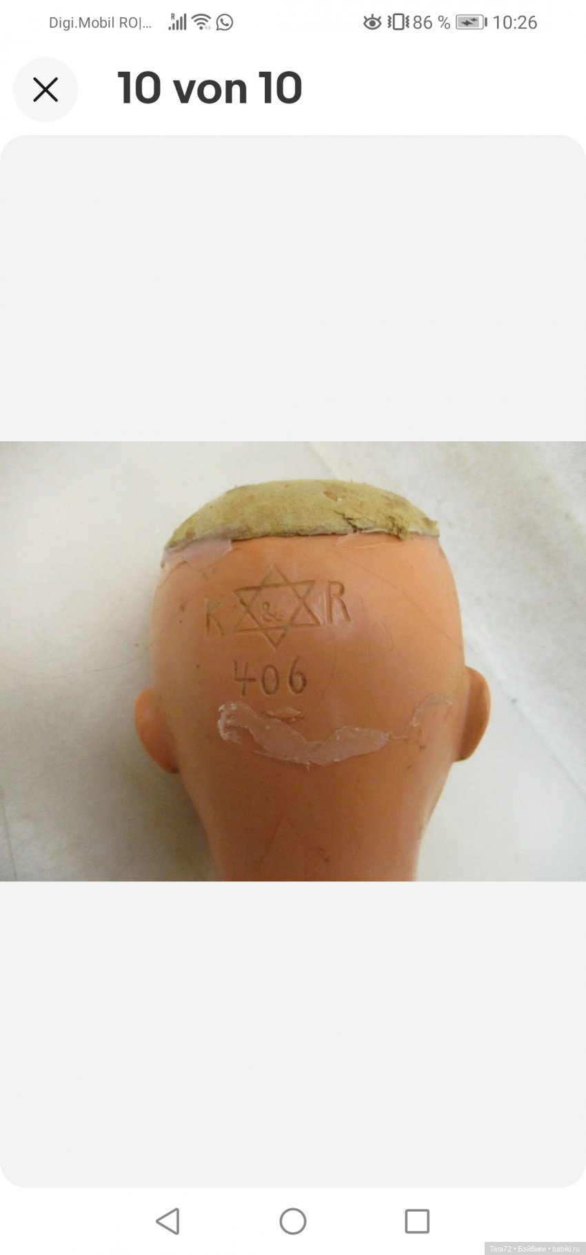Здравствуйте! Купила «ради интереса» разбитую целлулоидную головку с клеймом K&R 40 C (или 6?) 30 и изображением черепашки. После отмачивания гипса голова распалась на 12 кусочков, целлулоид оказался хрупким как яичная скорлупа. Склеила. Парик из натуральных волос рассыпается, так что буду делать новый. Один глаз был разбит, но удалось склеить.
