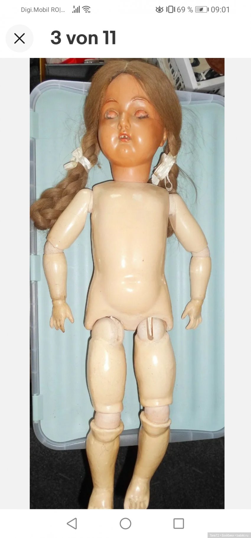 Ранее в одной из публикаций видела скан страницы с подобной головой, но сейчас никак не найду. У меня большая просьба: хочу узнать годы выпуска таких головок и как выглядела кукла вместе с телом.