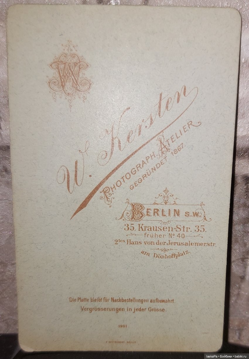 … Фотография была сделана в Дрездене, Max Baum, Dresden-N. На карточке также указан адрес: Königsbrückerstr. 66, и телефонный номер, что характерно для конца XIX — начала XX века. Наличие телефонного номера на визитной карточке указывает на то, что снимок сделан не ранее 1890-х годов, поскольку телефоны начали активно использоваться в Европе в этот период.