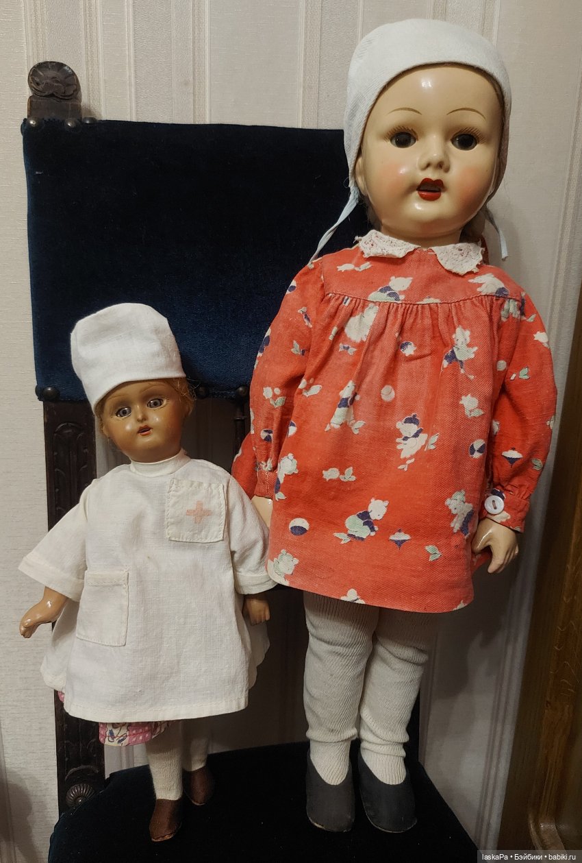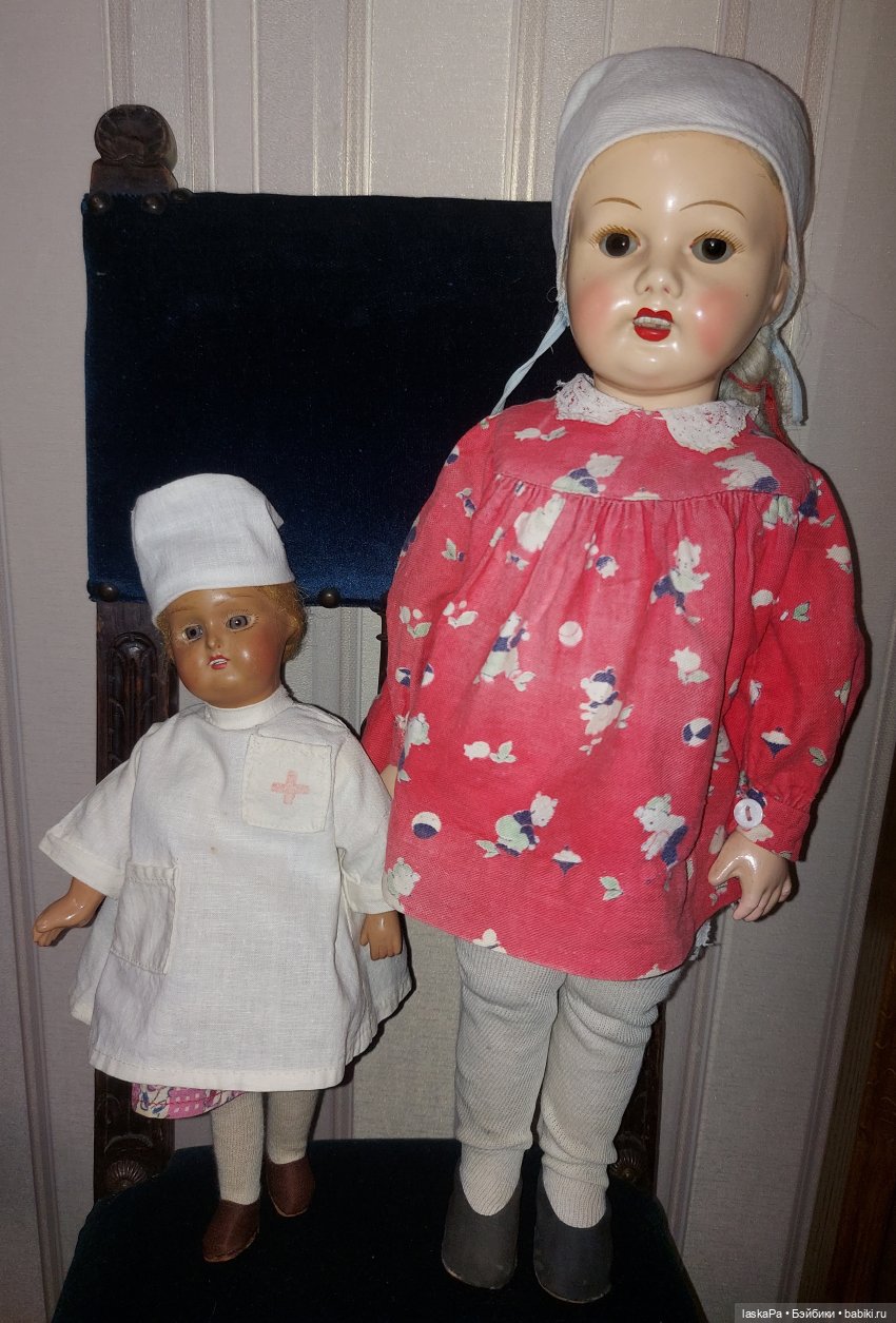 Покажу, пожалуй, пару кукол, которые теперь у нас стали редкостью. Это две куколки Загорской артели Рабоче-Крестьянской Красной Армии (РККА) (Бывшей фабрики Дунаева). «Дуни», как их сейчас у нас называют, частично делались сувенирными, на экспорт (в красивых русских костюмах), частично были игрушками для детей (в обычных платьях). Санитарка, возможно, была все-таки сувенирной (форменная одежда), не знаю, большая же кукла игровая. Последнюю я купила у прежней владелицы, которая получила её вместе с старой дачей, проданной со всем содержимым.