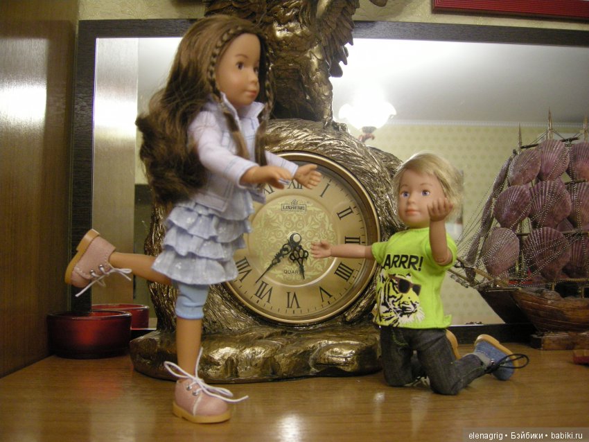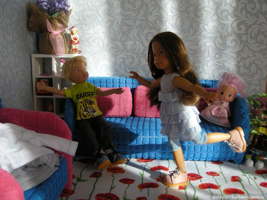 А теперь — переодевания :) У меня это один из любимых моментов — одевать куколок в наряды друг дружки, и смотреть, кому что идет, на ком лучше сидит :)