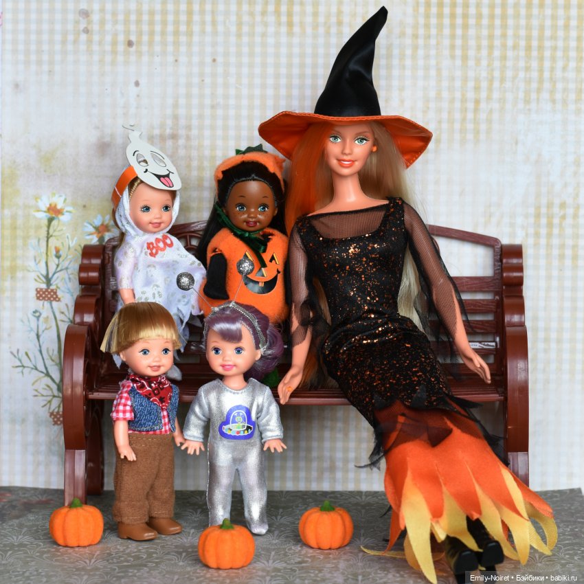 В моей коллекции Дейдри нашла любящих родителей. Ими стали Барби–йога (мулатка в сером топе), которую зовут Тереза и калифорнийский парень Стивен («2005 Cali Guy Scented Doll Steven» подробнее о нем читайте здесь). По-моему дочурка очень похожа на папу. По крайней мере, у них очень схожий цвет глаз. У меня даже возникла небольшая легенда. Мама помогла малышки сделать свой первый костюм на Хэллоуин. Родители решили вместе сопровождать дочку во время охоты за конфетами. Сегодня они обязательно соберут много сладостей – ведь Дейдри в костюме тыквочки само очарование.