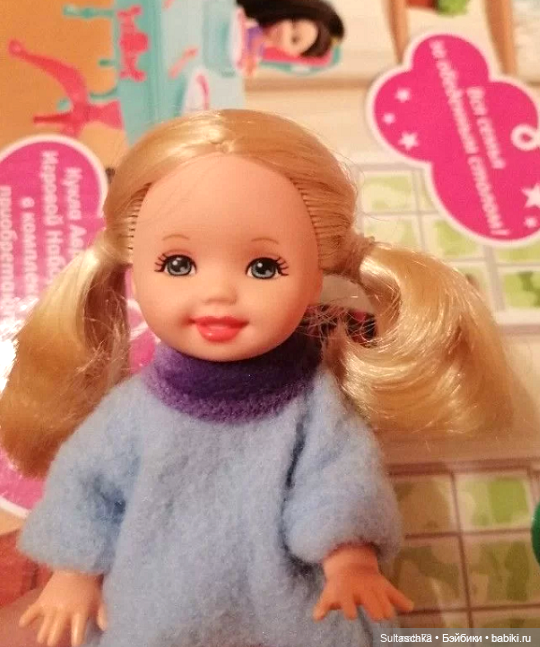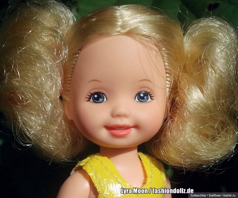 Я сначала подумала, что куколке до меня кто-то просто обрезал волосы, стала искать, что это за малышка. Оказалось, что выпускались куколки прямо с такими причёсками. Сначала подумала, что это Келли-лягушонок, но при ближайшем рассмотрении оказалось, что у лягушонка волосы немного другого оттенка и глаза зелёного цвета. У моей же глаза другие. Покопалась ещё — оказалось, что это цыплёнок: