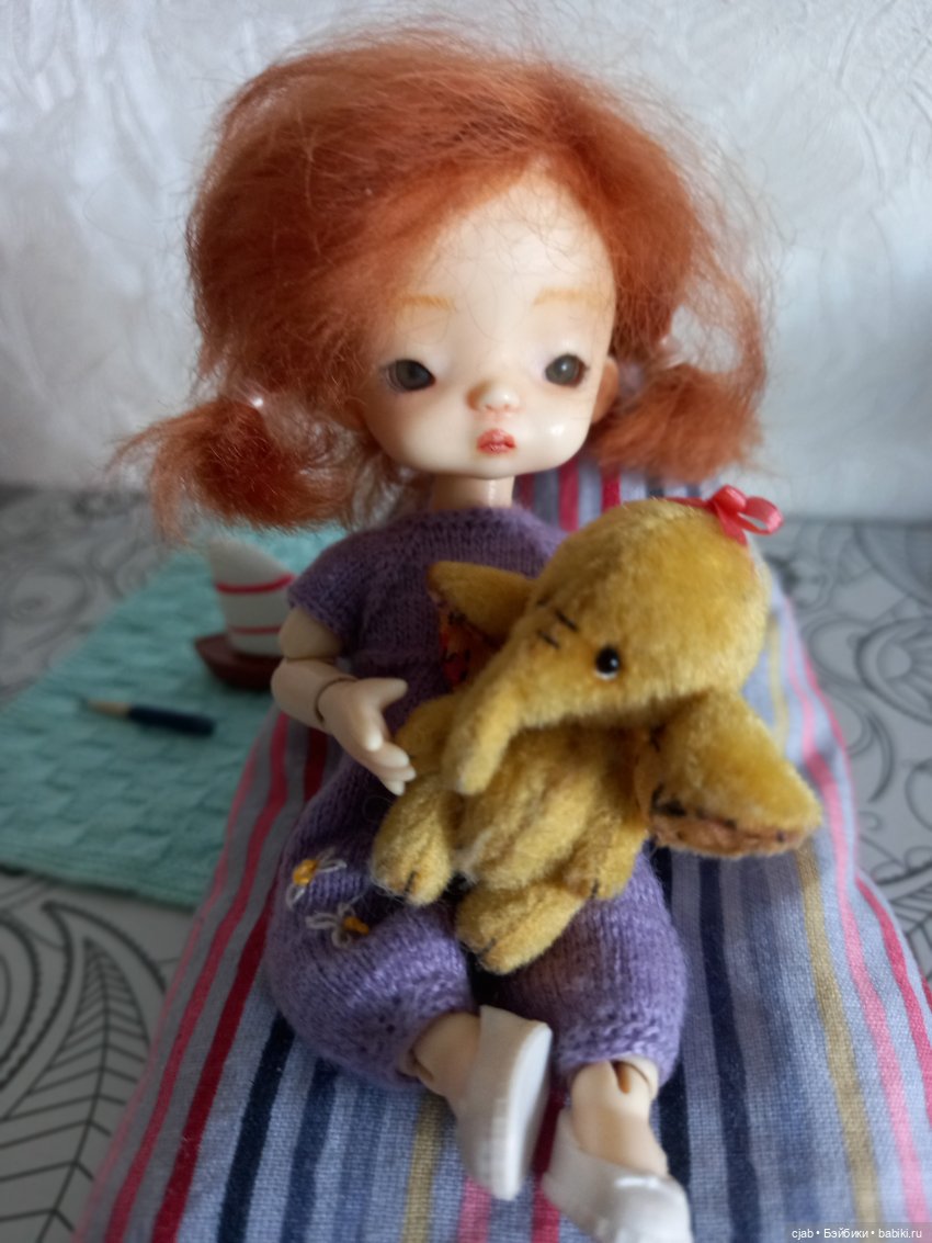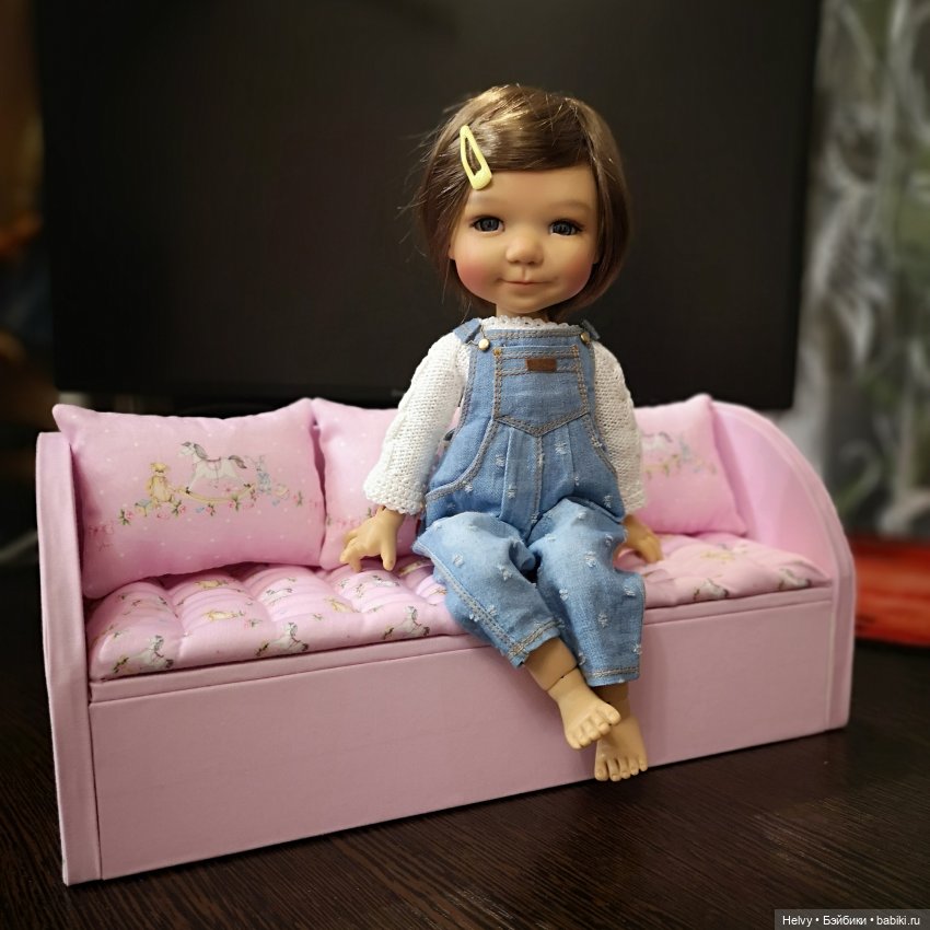 Диван я сама делала. Он для кукол большего размера. Но для фото малявочки тоже сгодился.