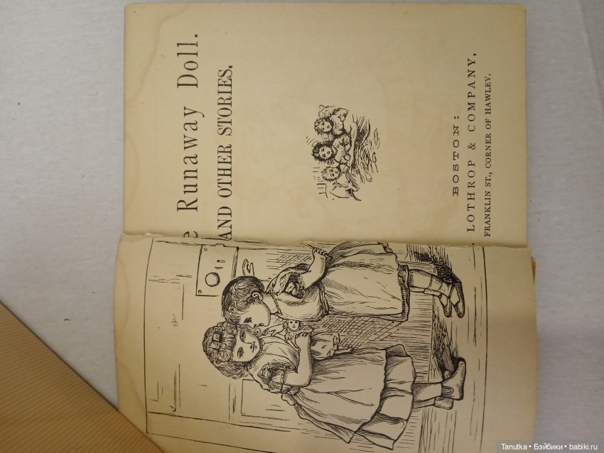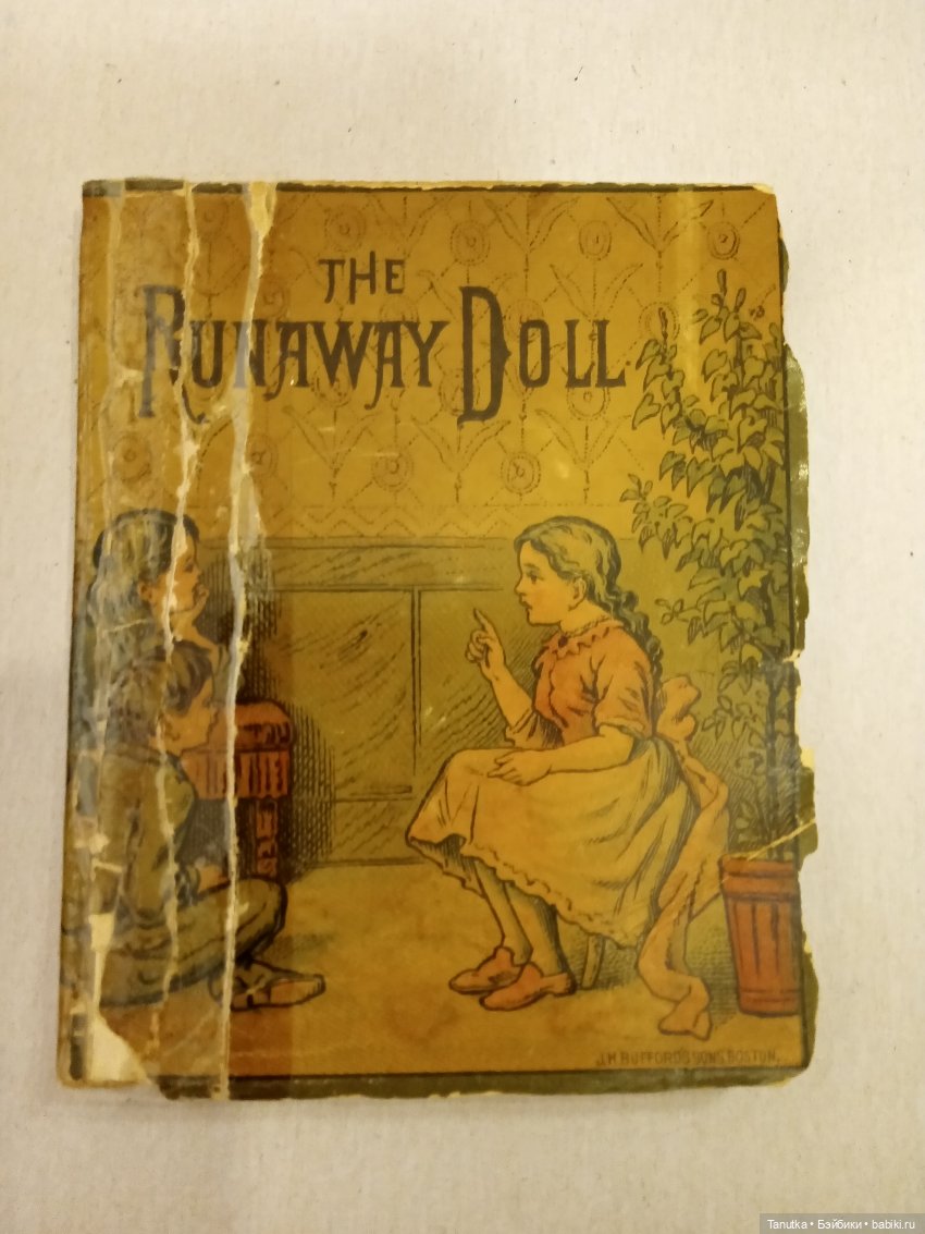 А потом мне попалась эта! Она — чудо) Крошечная, 9 на 11 см размером. Крепкие странички, потемневшая и хрупкая обложка. Похожа на книжки-малышки из нашего детсадовского детства, только формат ещё меньше. Название «The Runaway Doll», издана в Бостоне. Половина страниц — иллюстрации, крупный шрифт для малышей, и слова… разделены по слогам)))