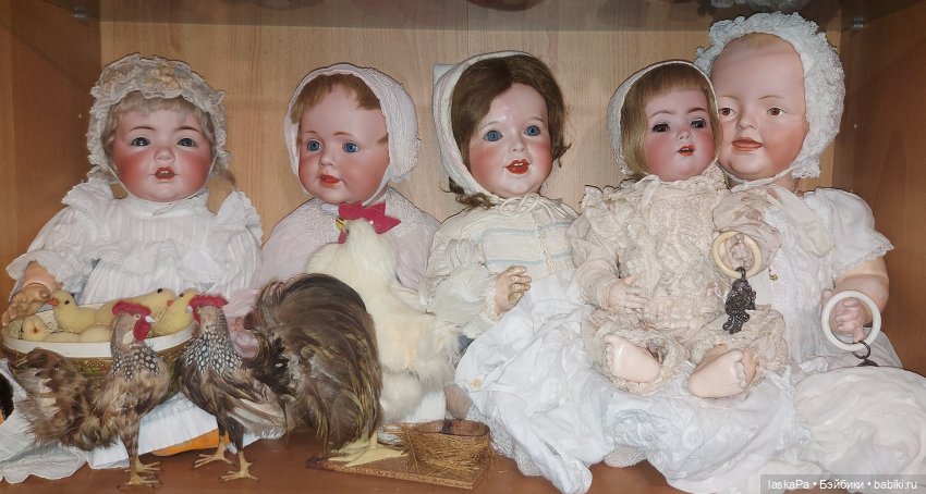 Про ауру антикварных кукол — они для меня уже не куклы в общепринятом понимании, а некие предметы(если так можно выразиться), обладающие, наверное, не душой, а неким отпечатком, обладающим воспоминаниями и этим они меня ну ооочень притягивают — обожаю мистику. Наверное, многие обладатели таких кукол замечали, как может меняться выражение их личика, например, по приезду и через некоторое время — это уже совсем другая кукла и загадка так и остаётся неразгаданной)))). Реплика у меня есть, но только одна и со своей особой энергетикой, не похожей ни на что, думаю, это от автора ей такой подарок достался))), остальные разъехались кто куда, возможно, если бы места было больше, никуда бы их не отпустила — по натуре я хомяк, но драгоценное пространство нужно мне для них, таких необыкновенный вечных девочек.