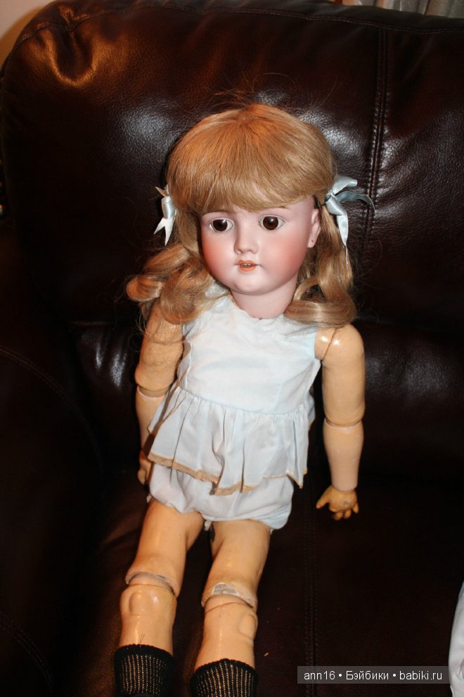 Я уже давно купила эту куклу. Но с начала у меня не было времени, потом были проблемы с интернетом. Но наконец я сделала топик !))) Я купила большую и очень красивую куклу от Kestner & Walkure. Кукла 30", довольно большая! И мне очень понравилось платье и особенно её парик из натуральных волос. Но какие у неё добрые глазки !=) И какой у неё милый маленький носик ;) Но у неё был небольшой дефект, у неё не было 2-х пальцев. Но я вскоре их наращу .)