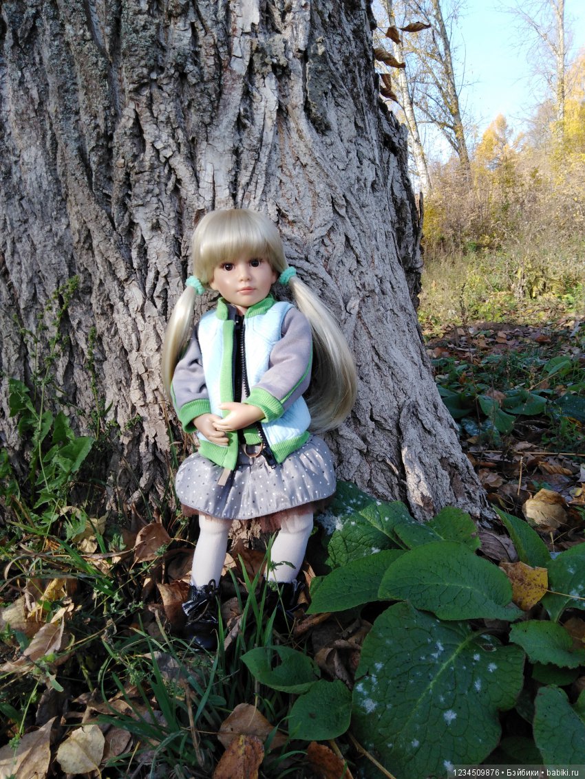 На улице так тепло, такое солнышко ласковое, но всё же — осень. Девочки утеплились, на всякий случай. Аутфит Надин отлично укомплектован для осенних прогулок. Нет в фабричном аутфите только шапочки. Но шапочка для Надин отыскалась в кукольном гардеробе. И по цвету подошла, и по размеру, как-будто я вязала эту шапочку специально для Надин. Лежала себе шапочка, полёживала и вот хозяйка нашлась.