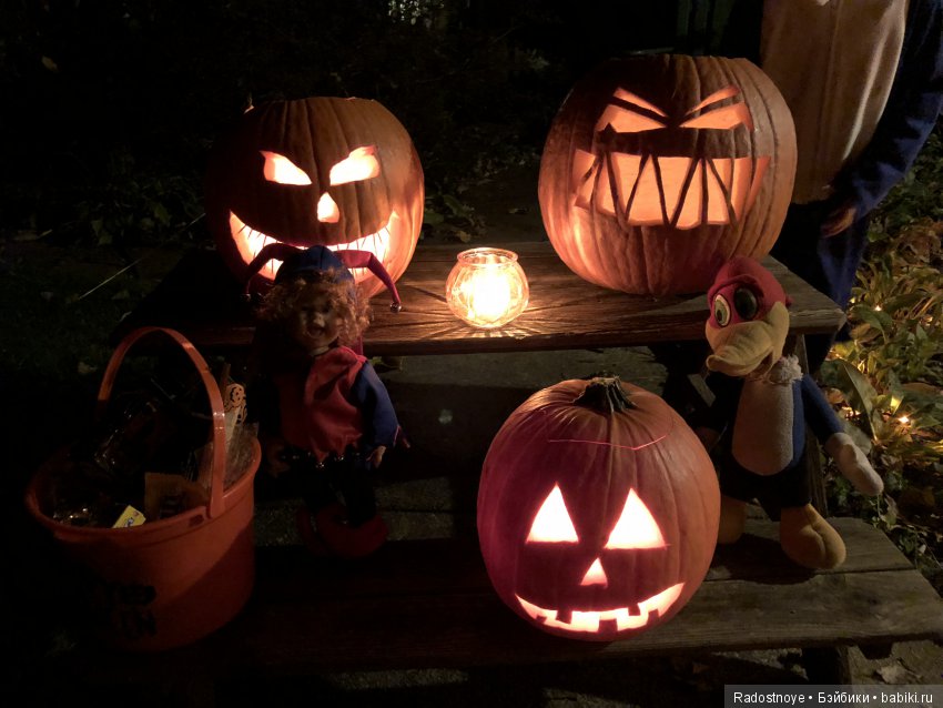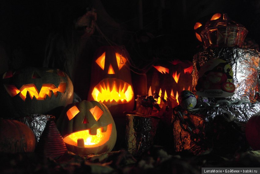 (Мы вырезаем тыквенные фонарики обычным острым ножом и ставим в них обычные свечки в металлических емкостях (фабричные), возможно поэтому не с каждой тыквой, точнее не с каждым фонариком, получается добиться идеально гладкого контура и свечения). А, может быть, это еще и от сорта тыквы зависит)). Извините, просто очень интересуюсь темой праздничных декораций и всевозможными техниками)).