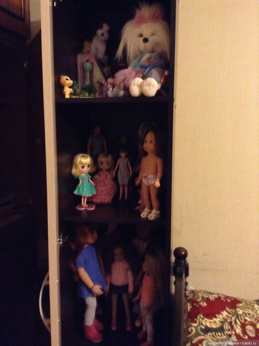 Витринка у меня маленькая — куклы как сельди в бочке, и обратите внимание Кирстен уже перекочевала за шкаф к приходу мужа — утром опять на комод переедет :-))) Вот так и играем…