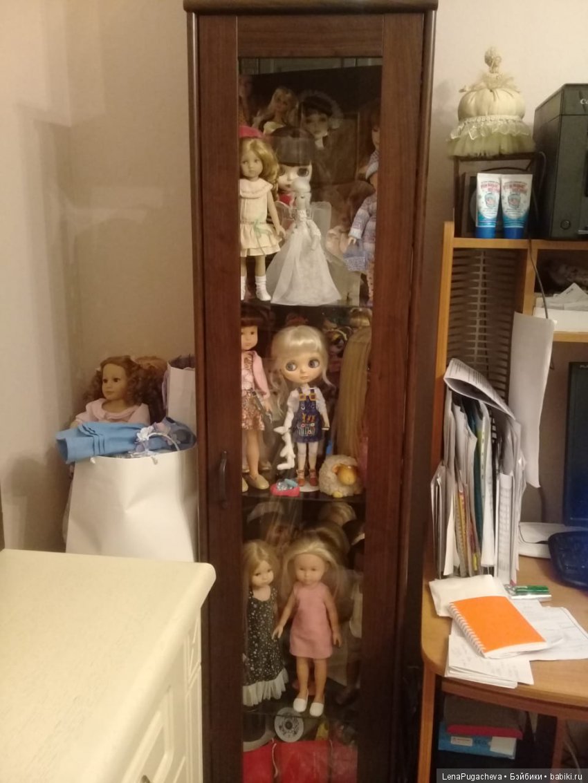 У меня витрины пока нет, после переезда уже покупать буду, остатки коллекции стоят в шкафу в тёмном месте)) сразу всех не видно. Три куклы в ряд в трусах, одежды им связано много, но пусть лучше проветриваются. В витрину уже поставлю одетых.