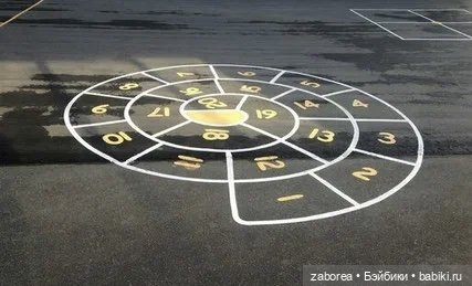 Только наши не закручивались в спираль. Просто круг большой разбитый на сектора, внутри малый. Нужно было прыгать на одной ноге с сектора 1 до 9, передвигая этой же ногой, на какой прыгаешь, биту из сектора в сектор, перемещая ее то влево, то вправо, пока не дойдешь до 10 в центре. Не заступая и не попадая битой на черту или за классы.