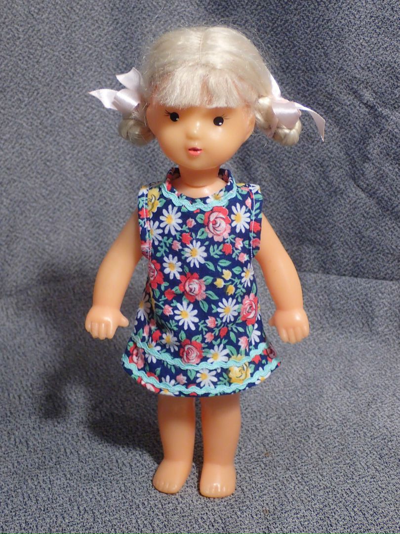 Многим может показаться, что у Оли платье слишком страшное для «прихорошенной» куклы, но не всё так просто. Дело в том, что платья с принтом НЕЛЬЗЯ СТИРАТЬ. Никак, ни в каком виде, даже руками. Вот такое было качество печати. Поэтому вида 100% нового ему, увы не придать, а имитировать массовую печать принта кустарными штучными технологиями невозможно. Большая удача, что оригинальное платье сохранилось в пригодном для демонстрации виде.