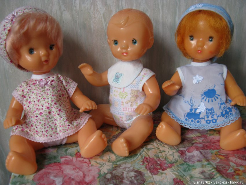 Прошедшие восстановление и прихорашивание советской куклы фабрики «Кругозор» — паричковая Юля (одежда реплицирована), в платье с принтом Оля (одежда оригинал) и сидячая неизвестно как зовут. UPD это Ниночка.