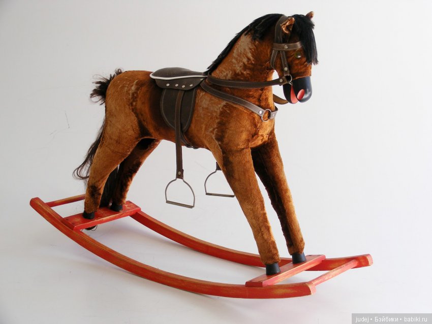 Коник набит стружкой, обтянут коричневым плюшем. Морда и копытца сделаны из дерева. К качалке прикреплен с помощью саморезов. Мне хотелось бы, чтобы лошадка была советская, но… Я проконсультировалась с коллекционером антикварных лошадок Еленой Кармацкой, по ее мнению коник немецкий или польский. «Может 80-90-е годы, а может ей вообще лет десять, а то и меньше».