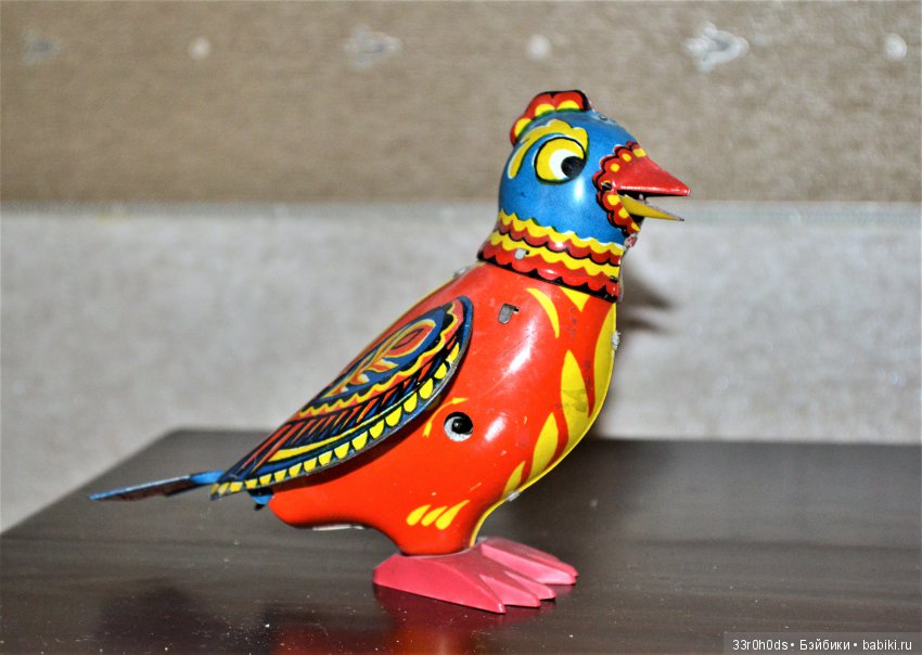 Начну с птички с которой все и началось. Это немецкая заводная игрушка фирмы Schuco (на данный момент это старейший экземпляр в моей коллекции). Выпускалась в Германии примерно в конце 40х-начале 50х. (А сама фабрика Schuco основана в 1912 году. Фабрика работает и по сей день, но выпускает теперь только коллекционные заводные модели автомобилей)