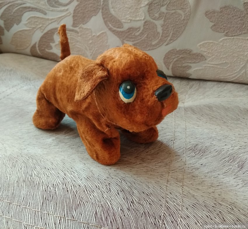Друг детства. Тошка. Именно этот вариант (полностью коричневый плюш) датируется началом 1970х, чуть позднее стали выпускаться двухцветные плюшевые бульдожки, затем белые, красные, желтые. А ближе к 1980 плюш заменили на искусственный мех.