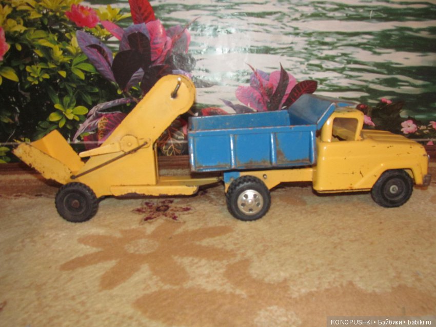 А у меня был вот такой автомобиль с погрузчиком, песок нагружать было здорово и перевозить в другое место, мне папа покупал, несмотря на то, что девочка.