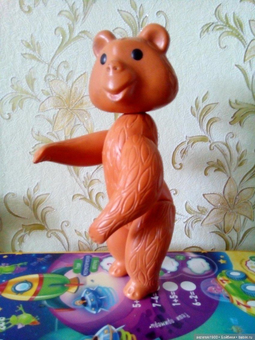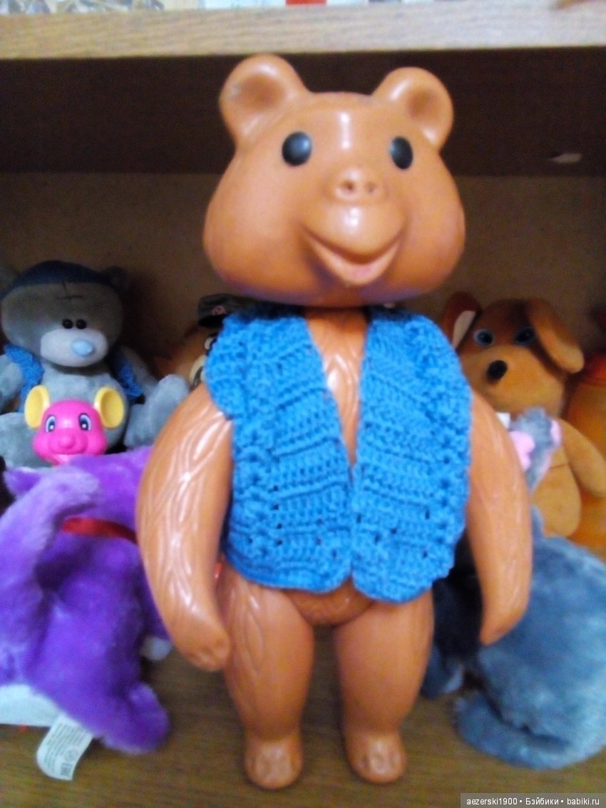 Мишутка. Такого в детстве у меня не было, был у подруги, стоял на салфетке на цветном телевизоре. Я на него смотрела и хотела ему жилет связать с треугольным вырезом. Просто приходила и мечтала) теперь у себя такого поселила, надо жилетку то связать!))))