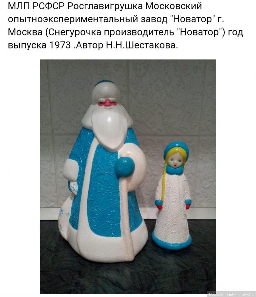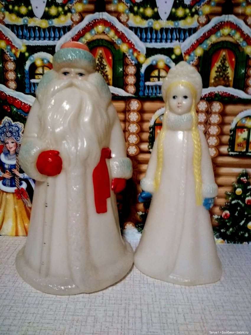 В серебристой шубе-современный, Снегурочка-Аксайского завода пластмасс, как уже писала Татьяна tatianakot, вот такой Дед Мороз ей в пару (были у меня 2 на восстановлении)