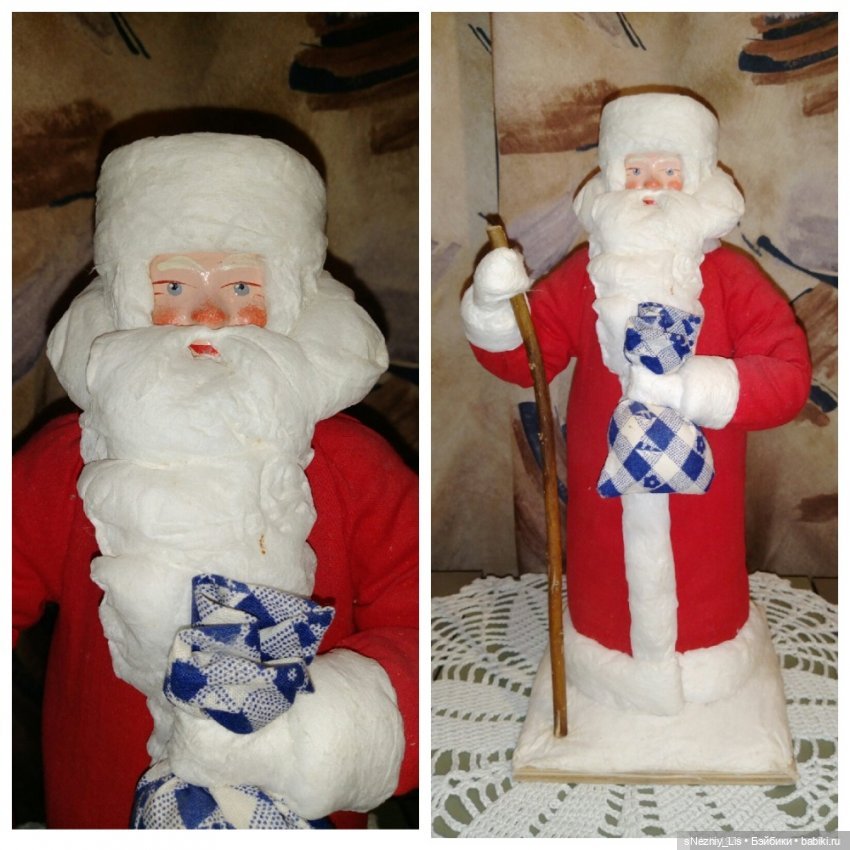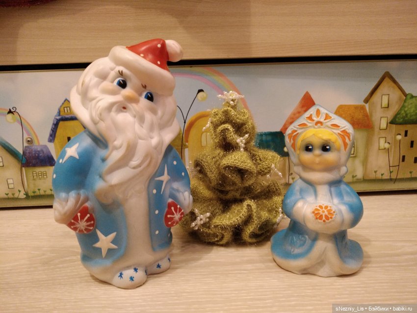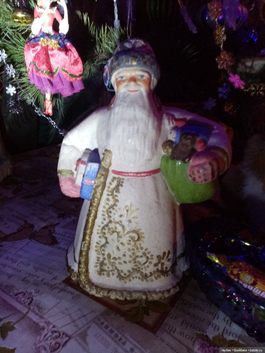 Вот такой у меня в детстве был, куплен ещё задолго до моего рождения. К нему ещё такая же снегурочка была. Долго они у нас прожили, а потом купили вот этих