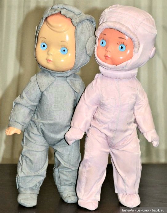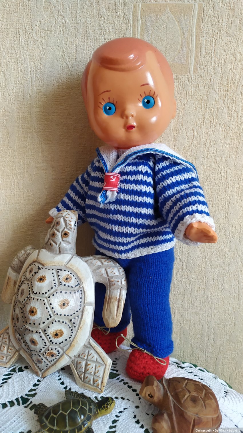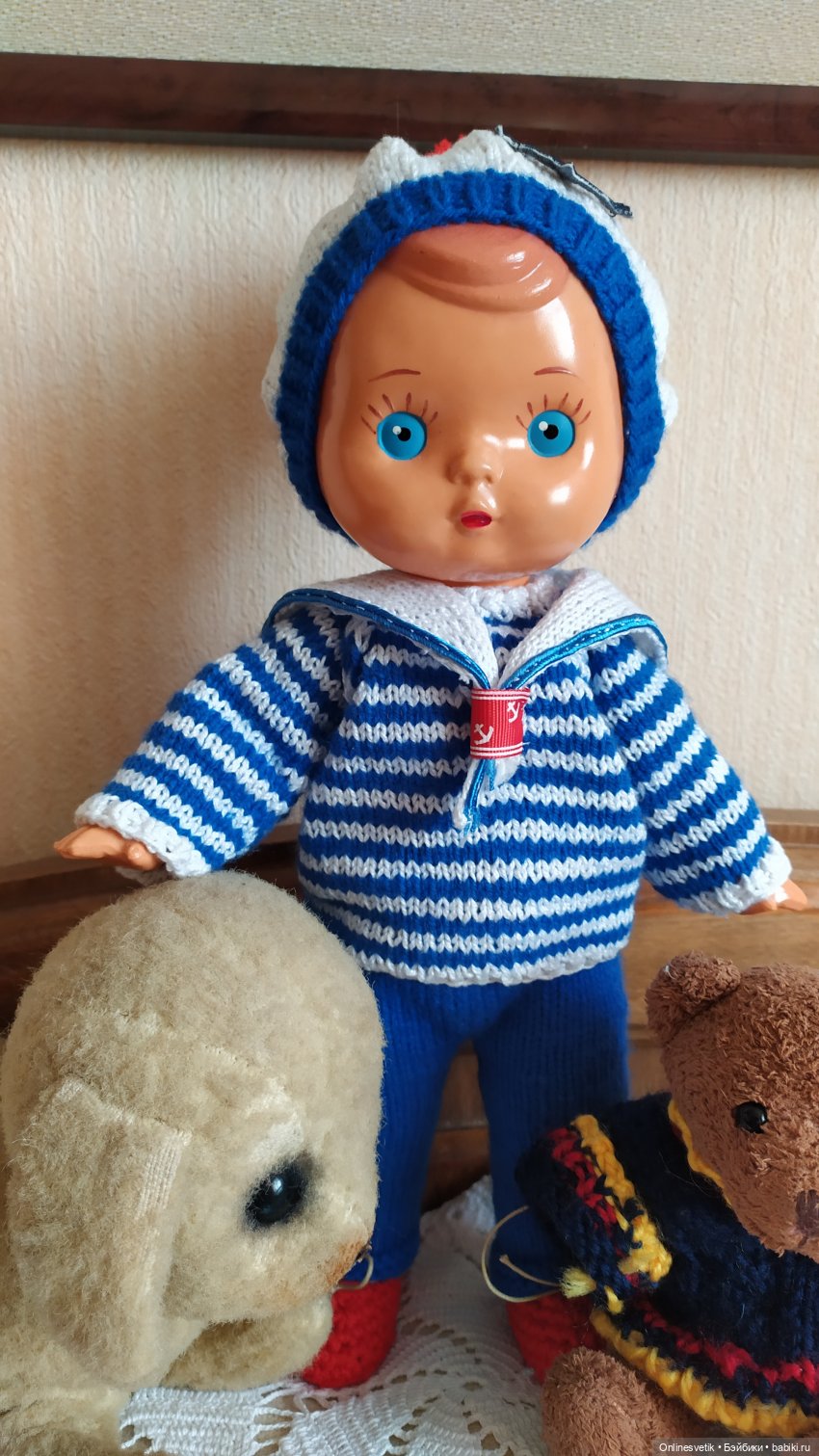 Делал этих милых ребятишек Завод пластмасс г. Котовск Тамбовской области. Клеймо на спинке — штурвальчик. Позже, уже став взрослой, я узнала, что выпускалась сестрёнка-близняшка моего Мишки, девочка с прической бараночками. Но я такую в детстве не встречала, увы. Не помню уже, во что я его одевала, но любимым он оставался на протяжении многих лет, пока не исчез в неизвестном направлении. Это было грустно.