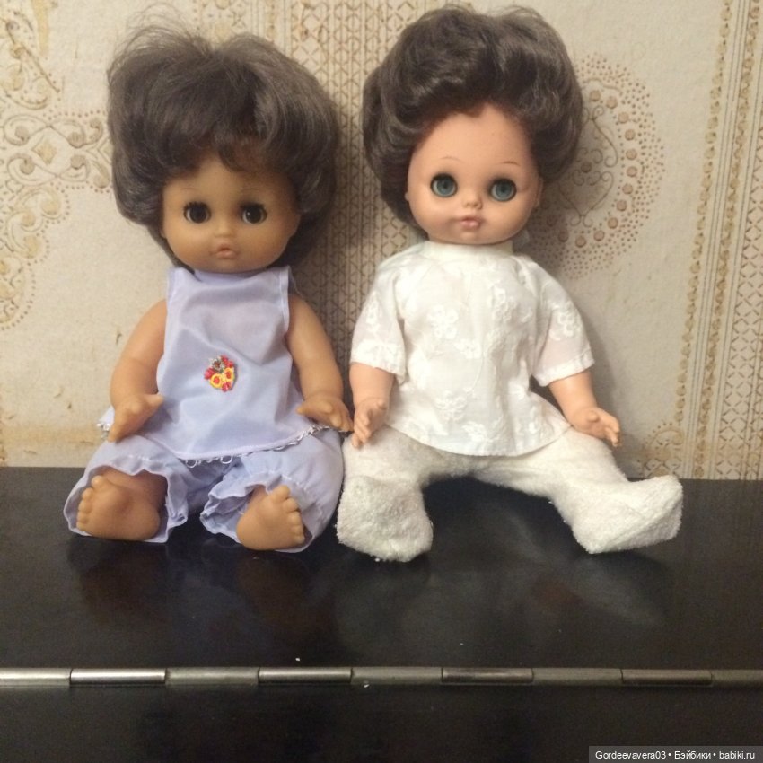 Живут у меня две винтажные куклы- пупсы. Размер одинаковый- 35- 36 см, обе с прошитыми волосами, формой тела, как у пупсов, крепления конечностей у обоих на резинках, что очень радует. У обоих моргающие глазки.